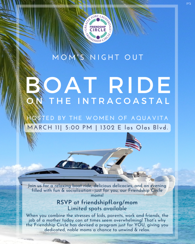 Join us for a relaxing boat ride, delicious delicacies, and an evening filled with fun & socialization hosted by the women of Aquavita on Wednesday, March 11—just for you, our Friendship Circle moms!